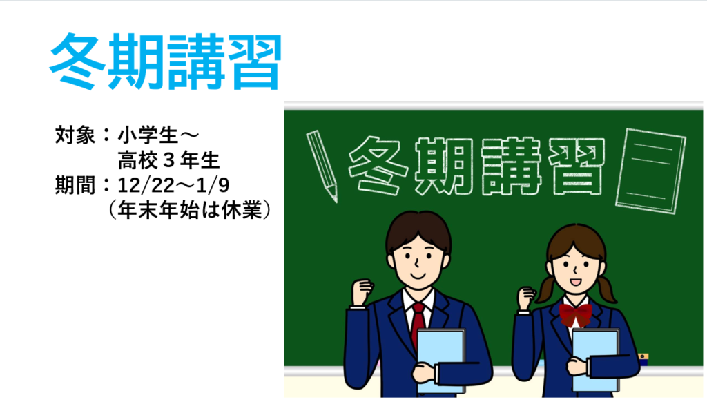 冬期講習期間中の営業時間は10:30~21:00までです(日によって異なる場合があります。詳しくをお問合せください)。